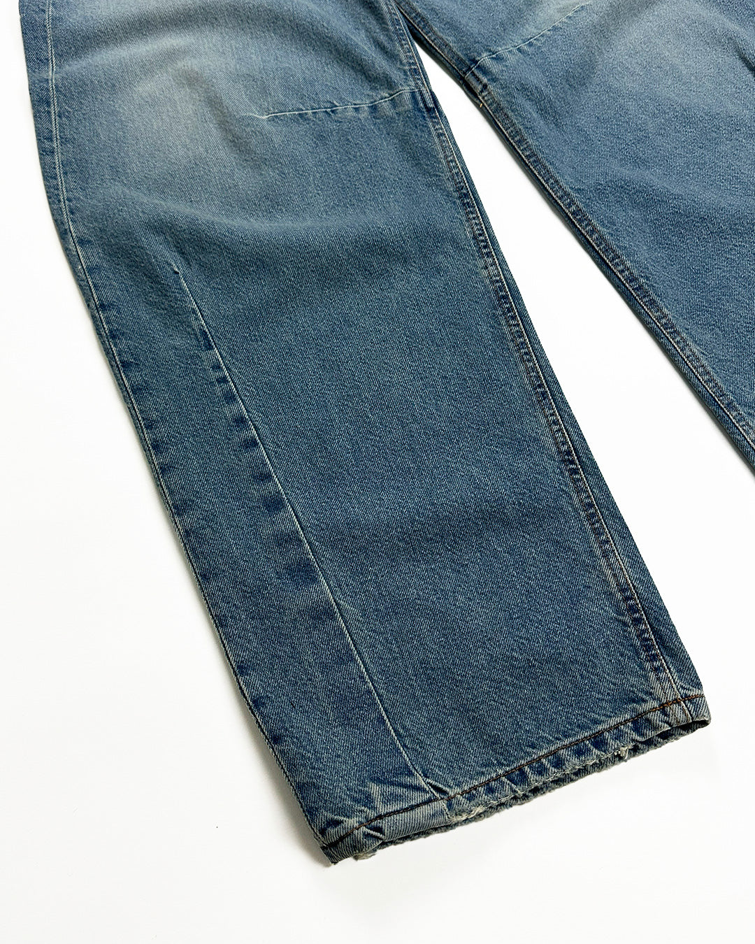 バレル・フィットの5ポケットデニム。ブルーデニムにミディアムライトのストーンウォッシュ加工。バックに刺繍ロゴ入り。